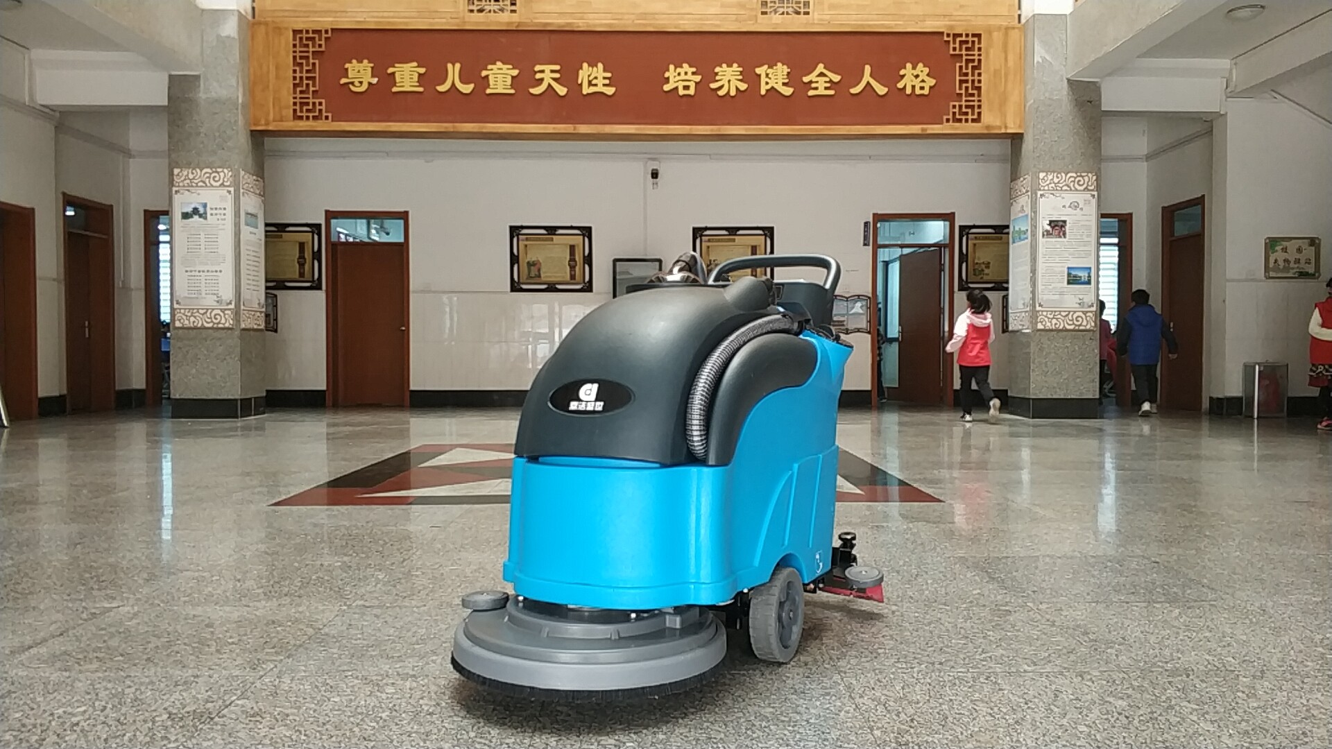 針對(duì)校區(qū)教學(xué)樓走廊,辦公大廳等公共區(qū)域,可以選擇鼎潔盛世DJ20手推式洗地機(jī),